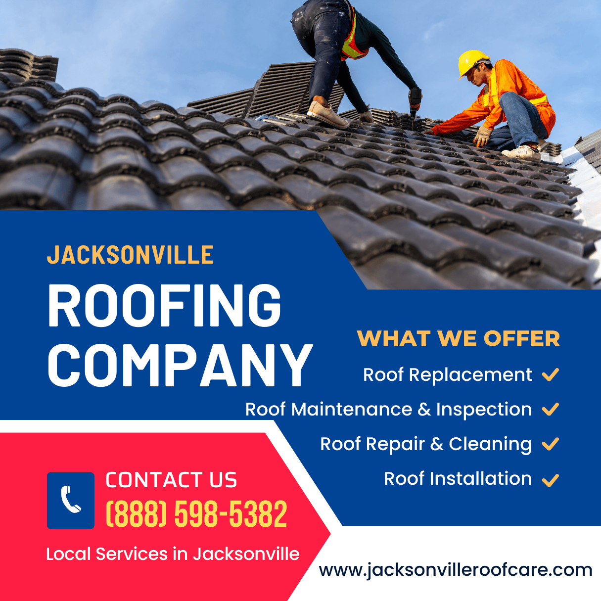 Secure your home’s roof with JacksonvilleRoofCare’s specialized services. Call (888) 598-5382 today to begin. Have your local ZIP code ready—we’ll assign the nearest team for prompt assistance.